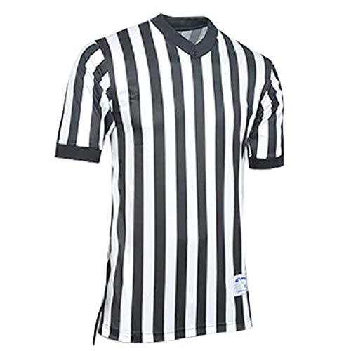 Birds eye mesh DRI-GEAR polyester fabric with printed stripes wicks moisture away from the bodyMitered, rib-knit, "V"-neck collar with ring for lanyard attachmentRib-knit cuffsExtended back tail with side vents